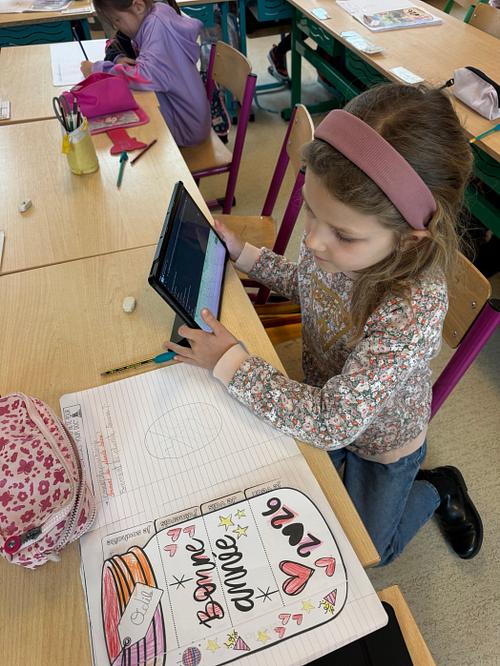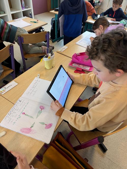 Une fois la question notée et le dessin réalisé 🎨, ils ont utilisé les tablettes 📱 pour en chercher la réponse 🔍.